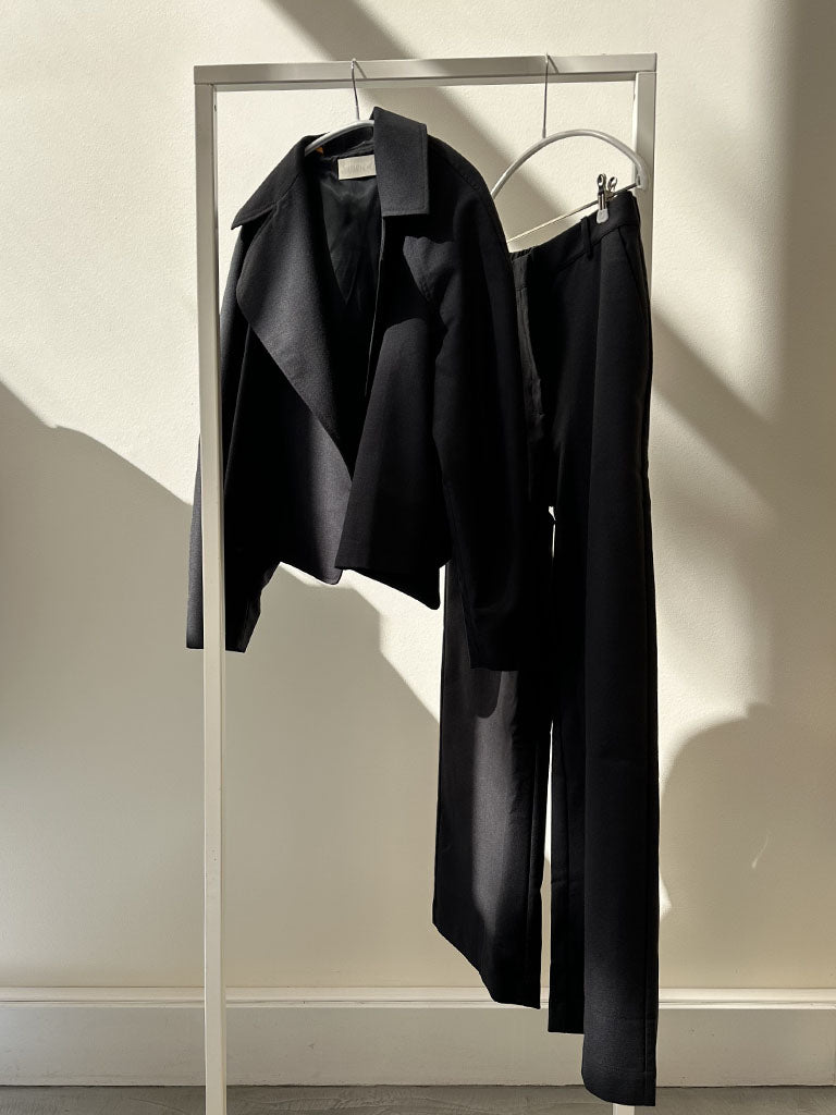 SARA PANTS are timeless trousers made in the same refined fabric as the TORRO JACKET – a soft and durable blend of 96% cotton and 4% wool in classic black.